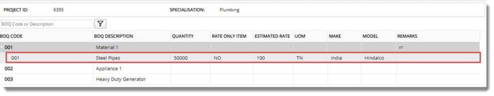 Created Item will be displayed under the respective BOQ Code.