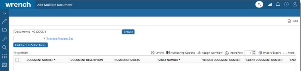 After generating document number and assigning a workflow, the next step is to add or upload documents to Wrench.