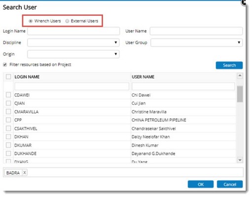 Resources in the distribution list are assigned to correspondence. To and Cc fields in the window is populated by the users defined in distribution list. Users (Wrench users and External Users) marked as To are displayed in the To field and users marked as Cc are displayed in the Cc field. If user groups are defined in the distribution list, system filters the resources based on the project role and resources are displayed in the respective fields.