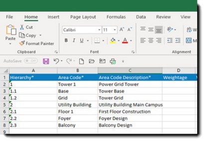 Areas can be imported in bulk using an MS Excel template. An excel template is generated, area details are updated in excel file and the updated file details is imported to system.