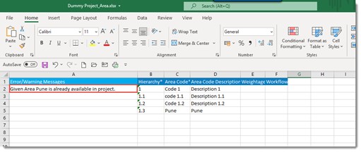 After exporting the area details to an excel file, details can be edited and edited details can be updated in the Project.