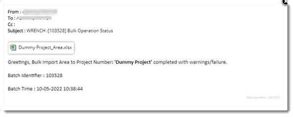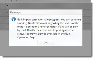 On importing the template generated from Import menu in Area window, if import operation fails, in the bulk operations log window a hyperlink, ‘Download Error Report’ is displayed. On clicking the hyperlink, an error report is generated in an excel file. If there are any errors, details can be imported after correcting the errors. If the bulk import operation fails, in the notification mail sent after completing Bulk Import operation, a excel file indicating the reason for failure is attached.