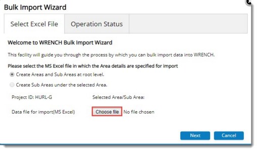 - File selection window is displayed. Select the saved excel file with area details and click Next.