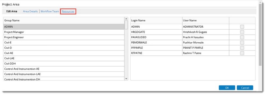 - Click the Resources tab and select the required users/resources for a specific Project area from the available list of user groups.