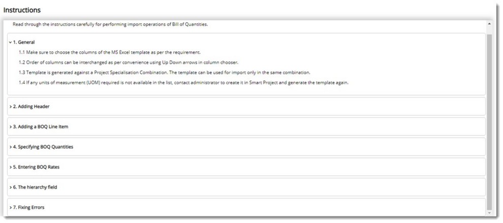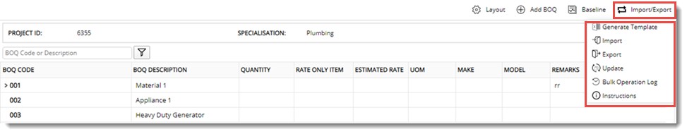 BOQ line items can be imported in bulk using an MS Excel template. Further BOQ line item details can be exported to an MS Excel sheet, values can be edited and then updated to the system. An MS Excel template acts as a medium for import and export. Detailed instruction is available for carrying out the Import/Export operation. The following operations can be carried out from Import/Export menu.
