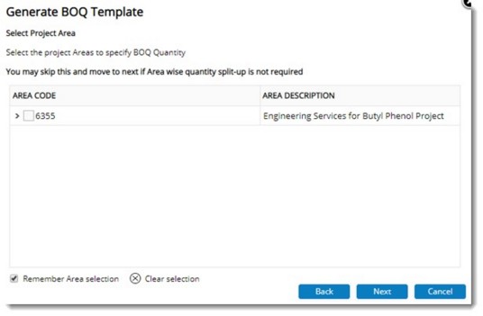 - Export Area wise quantity: If the checkbox next to this option is selected, then all the leaf level areas for which values are available will be exported. Each leaf level area columns will be named as ‘Quantity-Area Description’ and these columns will be arranged in alphabetical order.