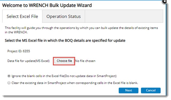 - Select the updated excel file. Selected file is displayed in the bulk update wizard.