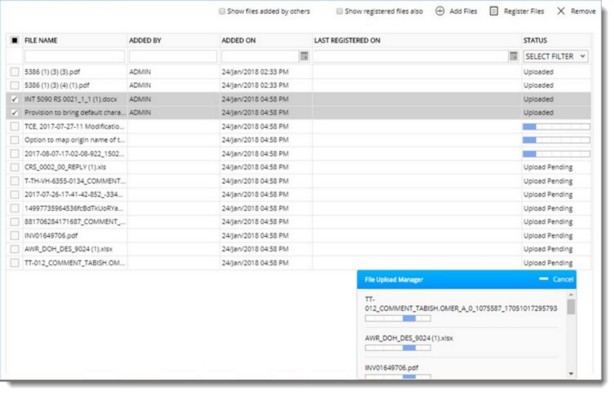 Show files added by others: At times, when the person who has uploaded a file is unavailable, it may require administrators to register files. Hence an option “Show files added by others” is required for administrators. If the check box next to this option is selected, files uploaded by other users are also displayed.