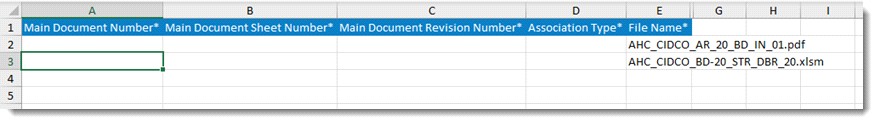 For Adding attachments: Using this option an excel template for importing attachments against specified documents in SmartProject can be generated. The generated template is shown in the following figure.