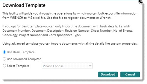 For Creating Documents: Using this option template for adding documents to SmartProject can be generated and documents can be added using the template. On clicking, this option Download Template wizard is displayed. Here different options for generating an import template is available.