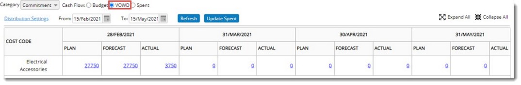 ACTUAL: For the selected date range, all the ‘Spent amount’ of the payment terms available in each month/week (actual dates are considered from ‘Spent information’) is summed up and displayed against that month/week. Subsequently these values are rolled up to the parent cost codes. (Refer the example illustrated above).