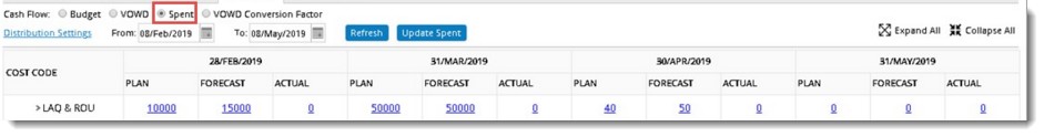 PLAN: For the selected date range, all the plan amount of the payment terms available in each month/week (plan dates are considered from ‘Spent information’) is summed up and displayed against that month. Subsequently these values are rolled up to the parent cost codes. Here, the sum of certification date and payment days is considered for computing the values.