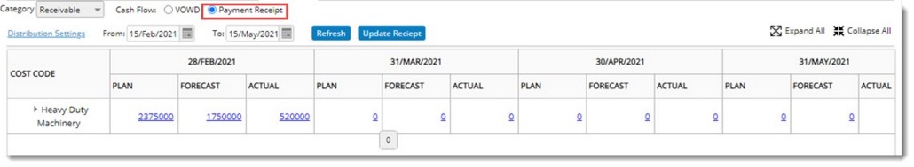 FORECAST: For the selected date range, all the forecasted amount of the payment terms available in each month/week is summed up and displayed against that month. Subsequently these values are rolled up to the parent cost codes.