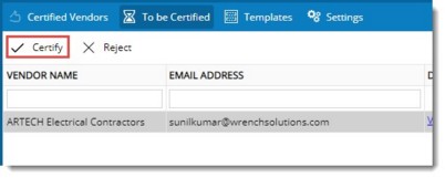 - Once the details are reviewed and found appropriate select the vendor and click Certify.