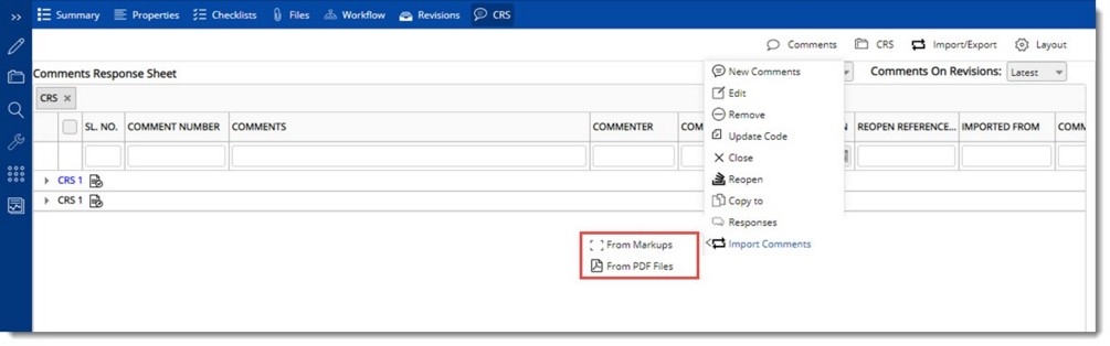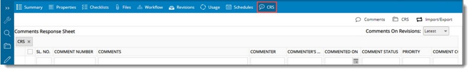 - In the Comments Response Sheet window click the tool bar item CRS. A menu is displayed.