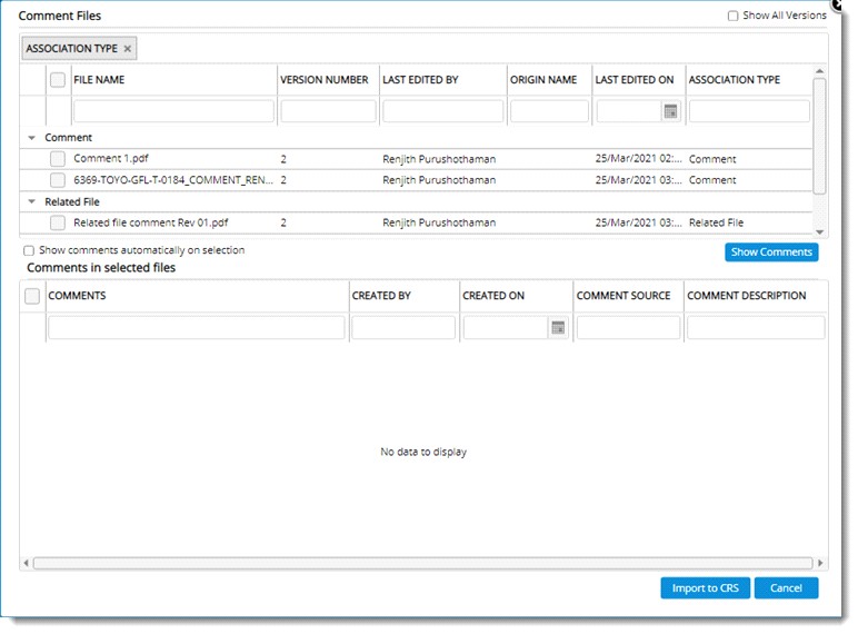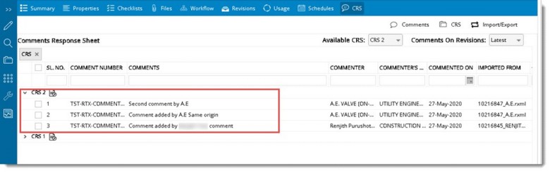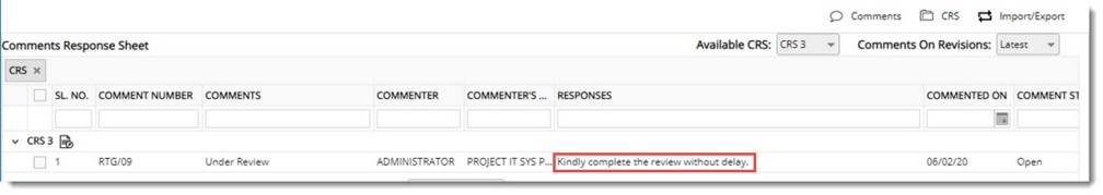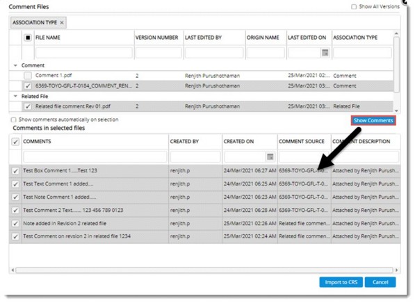 - Click Import to CRS. Comments imported successfully message is displayed.