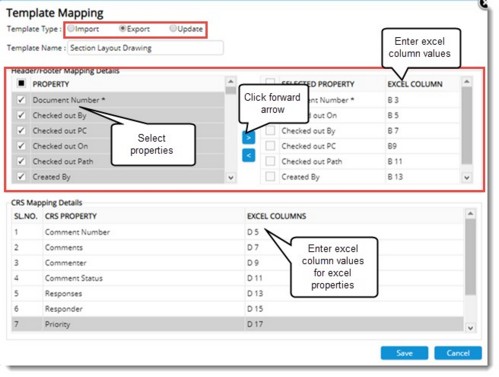 Comment details can be exported or imported using an MS Excel template. For this WRENCH CRS properties are to be mapped with columns in the MS Excel template. This mapping helps the system to identify the excel columns from where data is to be extracted and updated in the corresponding WRENCH property as well as export back to the Excel template.