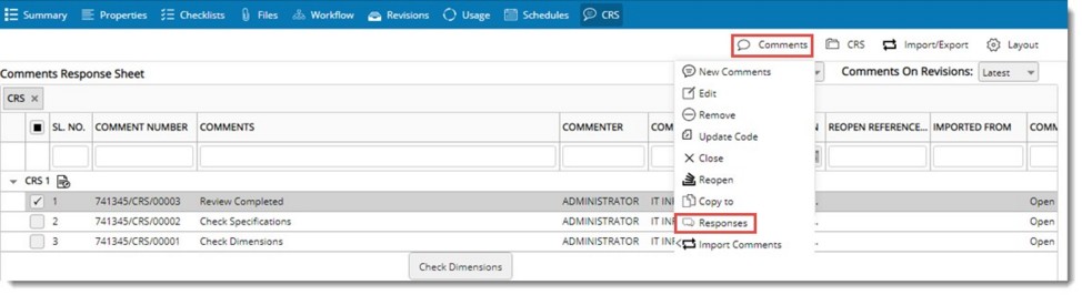 - In the CRS window select single or multiple comments and in the tool bar click Comments.