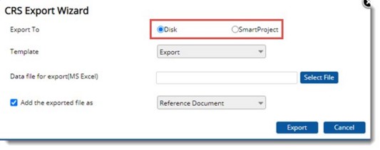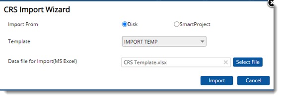 CRS data can be imported from files stored in the disk or from files in SmartProject. In some cases user adds the CRS file received from the client as a reference document inside the main document. If user wants to import data from a document already available in the system, then user may select the option SmartProject. MS Excel files containing CRS data, attached as reference documents can be selected.
