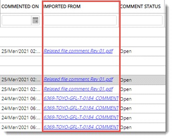 In the column IMPORTED FROM the name of the comment file, from which the comment is imported is displayed.