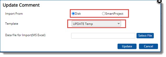 Options to update CRS data from Disk and SmartProject is available here. Instead of import template an update template can be selected from a drop-down list.