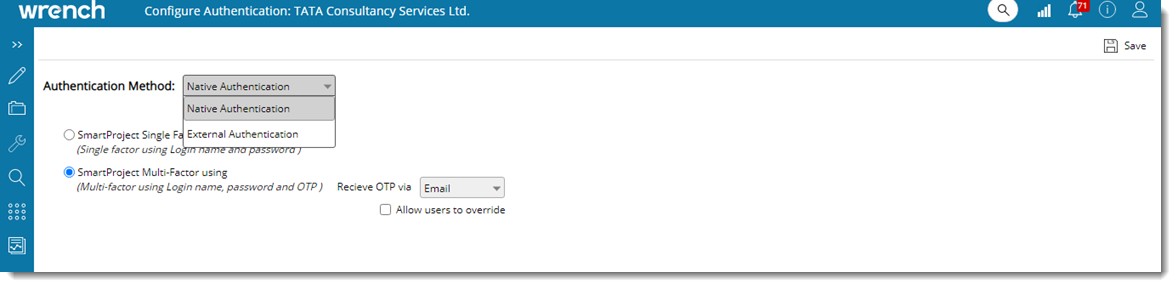 SmartProject supports both Native Authentication and External Authentication. In the case of Native Authentication, option to authenticate using single factor and multi factor is available. In the case of External Authentication, option to authenticate using MS Office and OKTA is available.