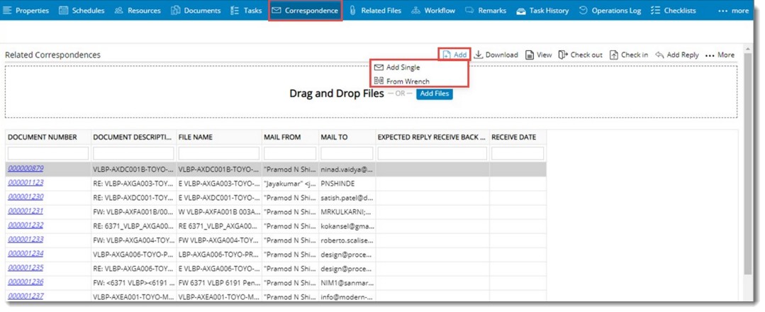 All the correspondences related to a specific Task will be added here. In addition details related to the correspondence like Document Number, Document Description etc. are available here.