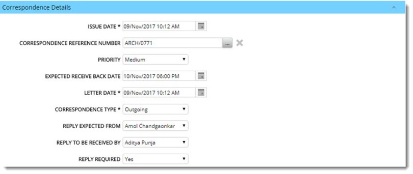 Correspondence Type: Select a correspondence type from a drop-down list. Types available are incoming and outgoing.
