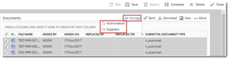 A pop-up menu is displayed with options to create Supplier Package and Authorisation Package.
