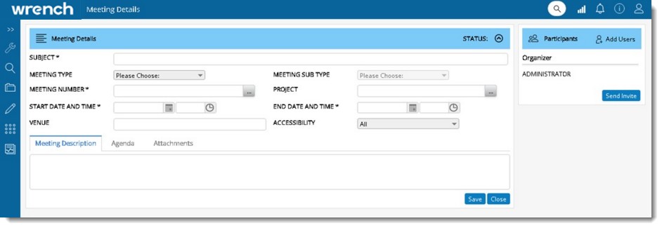 Meeting Details window is displayed. In the meeting details window name of the organizer is displayed. Here you can enter different properties for creating a meeting and add meeting participants. For more information on entering meeting properties see Entering Meeting Properties.