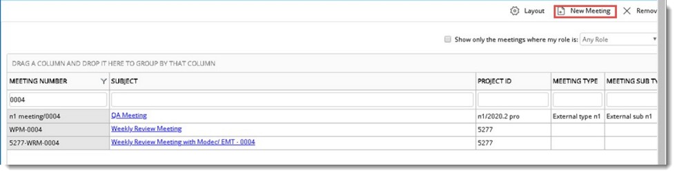In the window, meetings already created are listed. Meetings listed here can be filtered based on your roles.