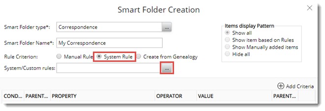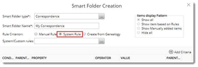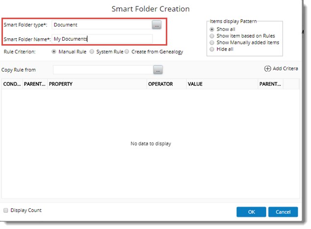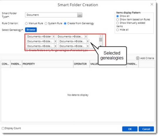 NOTE: When a smart folder is created using the Create from Genealogy option, the smart folder hierarchy is created as per the selected document genealogy hierarchy. If leaf level smart folder is selected, then in the Items Display Patter radio button next to Show All is selected. For all the parent level smart folder the option selected will be “Show manually added items.”
