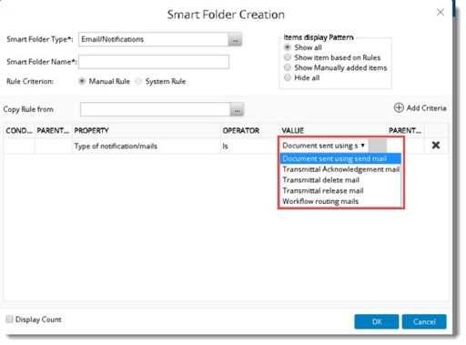 A smart folder type Notifications, to handle notifications will be available while creating smart folders. This folder is meant for handling Transmittal Release Mails, Workflow Routing Mails and Documents send using send mail option.