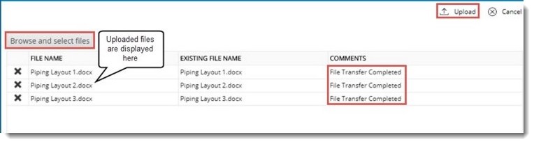 Selected files are displayed in the column File Name. In the Comments column a comment File Transfer Completed is displayed.