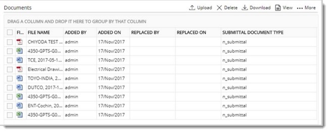 Submittal Types window is displayed. Here different submittal types defined for a project is displayed.