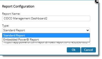 1. Type: Select a report type from a drop-down list. Options available are Standard Report and Embedded Power BI Report. Option Standard Report is displayed by default.