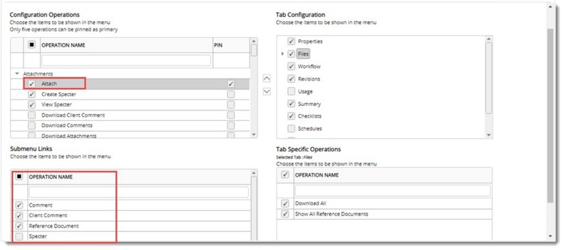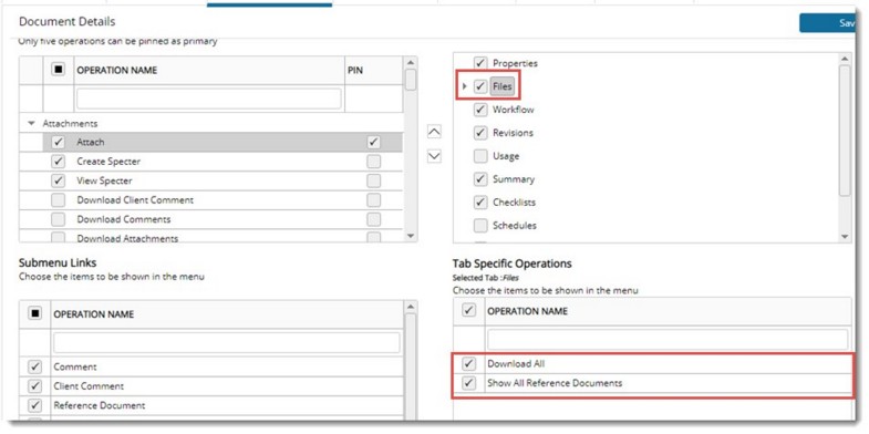 NOTE: Menus which are common to multiple tabs in document details are managed in a single go. When user enables ‘Attach’ menu in summary of document details it gets reflected in Files tab also. Similarly, when user disables a menu, it is disabled from all other similar tabs.