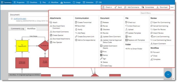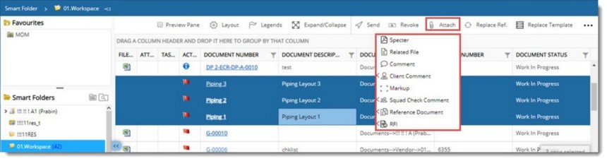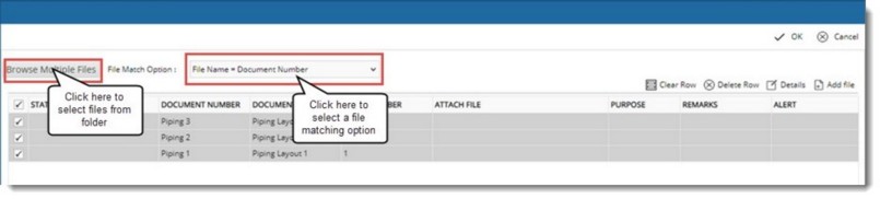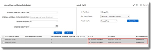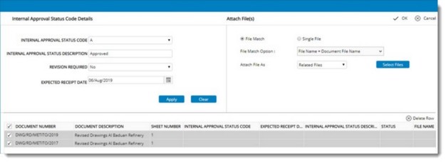 Updating approval status code in bulk: Internal Status Code can be updated after selecting multiple documents. In projects where Vendors and Contractors are involved, when Internal Approval Status Code (IASC) is updated against documents, usually any review comments about the documents are also attached to the respective documents. Facility to carry out these two operations (updating IASC and attaching comments) together will help user perform the document review faster and easier.