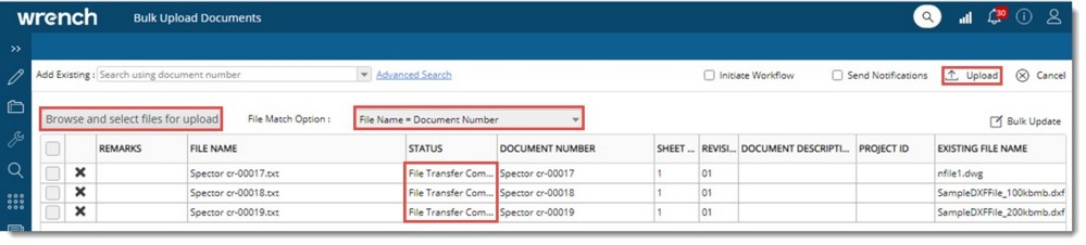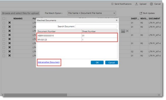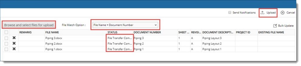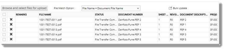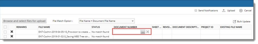 If the File Name (name of the file in the local drive) and the existing Document file name matches, in the Bulk Upload window status column, the status is displayed as Match found.