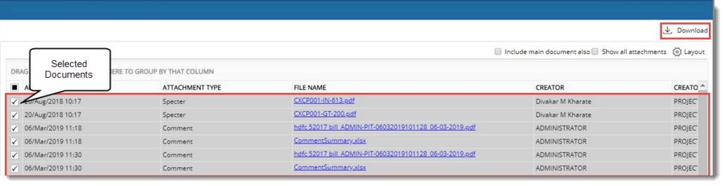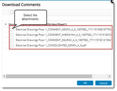 Click this option to download comments attached to a document. On selecting this option Download Comments window is displayed. In the window list of comment files attached are displayed. Select the comment files you want to download and click OK to continue with the download process.