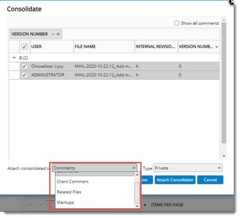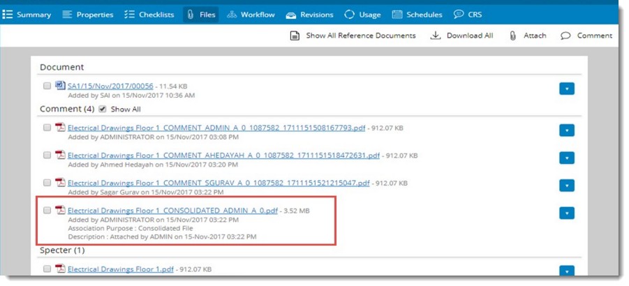 Comment files, consolidated comment files and reviewed consolidated file would be listed under the comments section in the attachments tab.