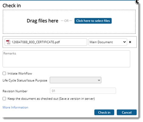 Check In is the reverse operation of Check Out. It is the process of sending a document back to the server after editing. The Check In button is enabled on the menu only if the selected document is checked out. A red tick mark indicates whether the selected document is checked out. On checking in a document the version number is incremented.