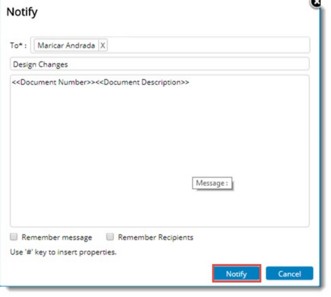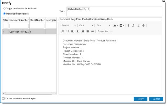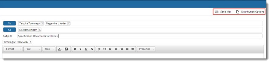 TO field will be filled automatically with the users who has worked on the document by default. Users in the To field can be modified. The Subject field will be filled by default as Document <<Document number>> is modified. Subject field can also be modified.
