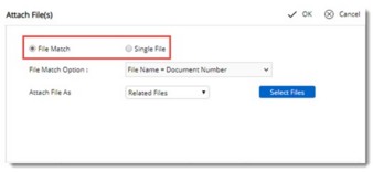 In the Attach File(s) pane, two options File Match and Single File will be available. These options can be selected by clicking the radio button. Radio button next to File Match is selected by default. If this option is selected, File Match Option will be available. A file matching option can be selected from a drop-down list.