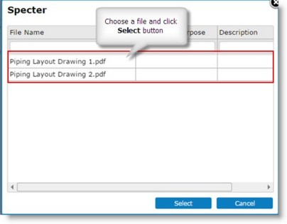 Once you click this option system checks for an auto attached specter file. If the file exists it is opened for commenting. If auto attached specter file is not present, system checks whether the main document is PDF. If so, the file is opened for commenting. If the main document is not a PDF file, system searches for manually attached specter files. If manually attached specter file is found it is opened for commenting. If multiple file exist the following window is displayed.