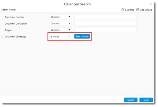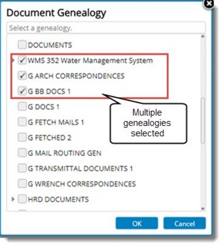 If genealogy is a search criterion while carrying out a document search operation, it is possible to select multiple values for a genealogy.