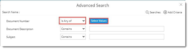 In the Advanced Search window, against Document Number an option Is Any Of is available in the drop-down list.