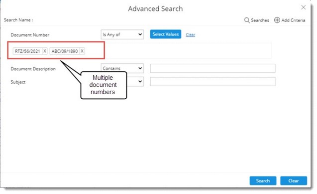 In certain organizations, it is required to search documents by specifying the document numbers as a list. Hence a provision to search documents using multiple document numbers is introduced.