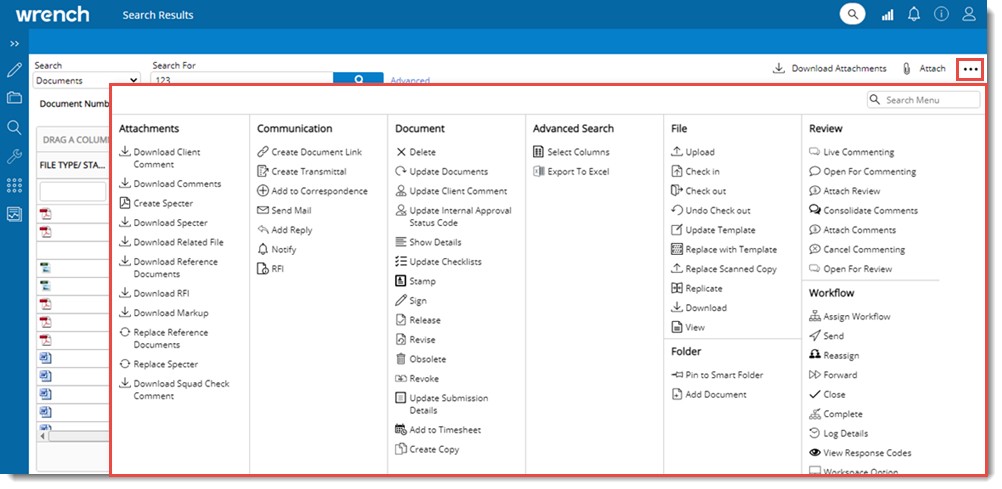 Different document operations can be carried out from the document search results window. These operations are available in the More options menu that is denoted by three dots. Based on the type of operation, menu items are arranged under different groups.