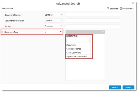 You can restrict the search operation to Correspondences, Documents, client comments and squad check comments. You can select document types from a drop-down list corresponding to the search property Document Type which is an additional search criteria. Click Search button to carry out a search operation.